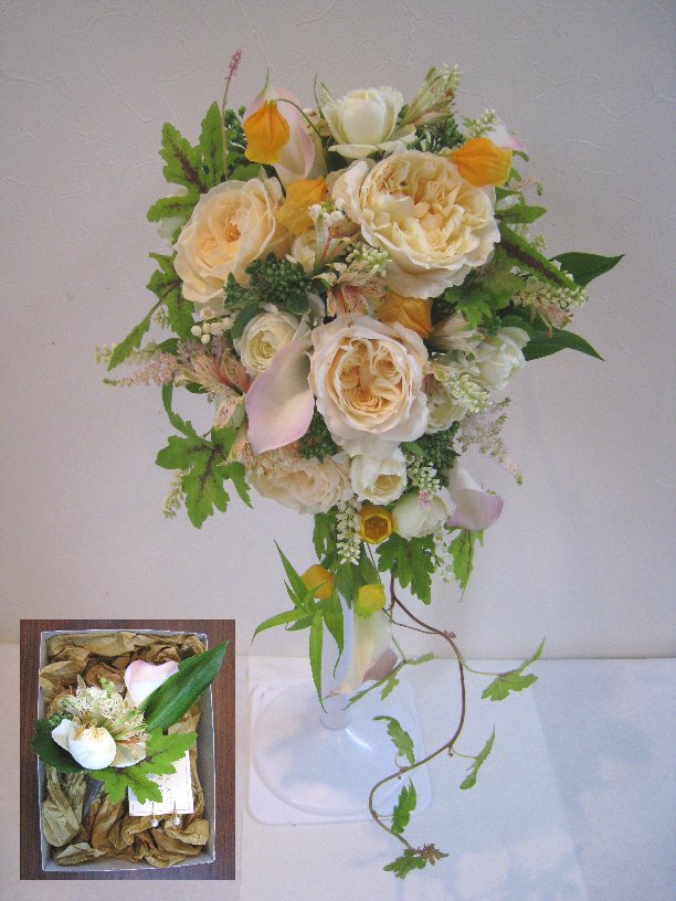 最良の日には最良のブーケで飾りたいもの。 ご満足いただくブーケをお作りするため、式当日にお召しになるドレスやヘアスタイルのお写真を拝見させていただき、ブーケをデザインいたします。 まずは、新婦様がご希望されるお花の種類やブーケイメージをお聞かせ下さい。 式当日に最も美しく映える生花のブーケはもちろんのこと、式の思い出としてずっと咲き続けるアーティフィシャルフラワー(造花)のブーケもお作りしています。 ご注文方法、お問合せは、こちらをご覧ください。
